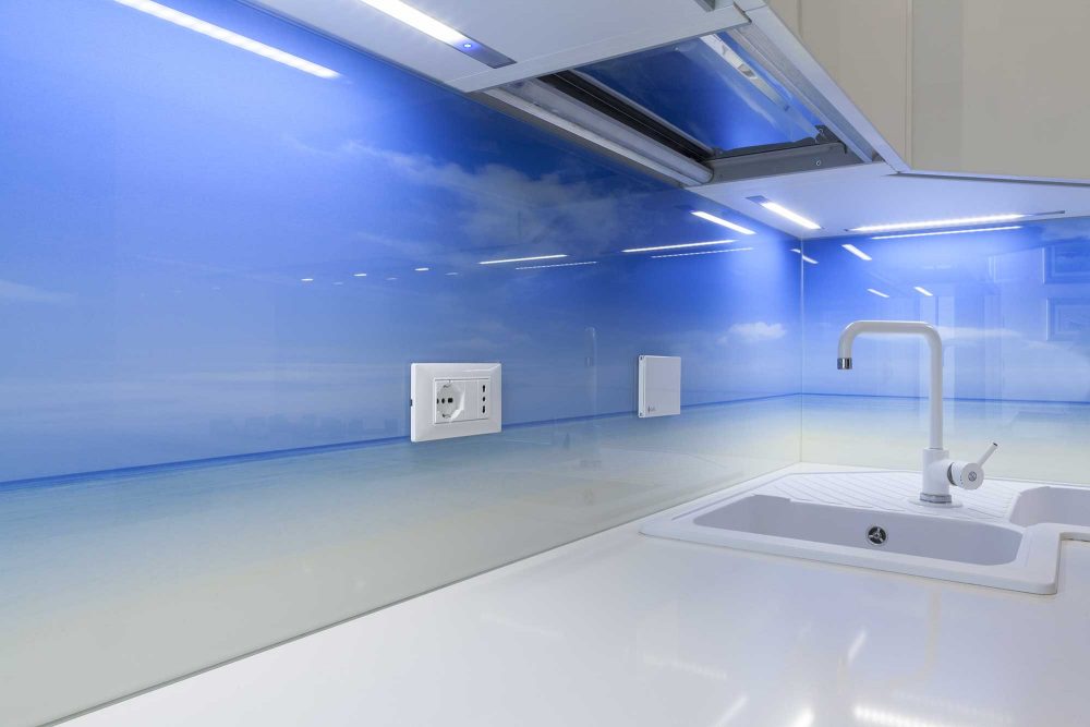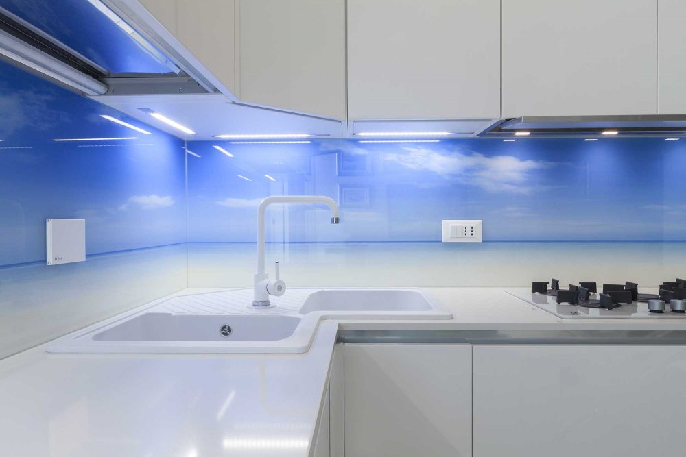 • Backsplash cucina: il vetro è stato lavorato con la nuova tecnologia di stampa digitale Cromoglass. Questa particolare tipologia di lavorazione ha permesso al nostro cliente di personalizzare le superfici a seconda del suo gusto personale. Abbinando la durabilità delle vernici ceramiche alla qualità della stampa digitale, una lavorazione innovativa, è stato ottenuto l’effetto desiderato dal punto di vista decorativo. Cromoglass rappresenta un’innovazione nella stampa digitale differenziandosi dalla tradizionale stampa serigrafica: il trattamento a cui viene sottoposto il vetro permette di raggiungere un’alta definizione estetica combinata alla sicurezza del vetro temprato.