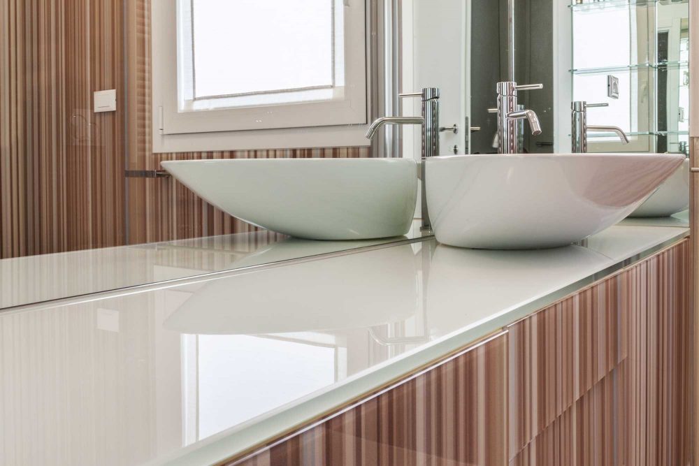 • Pareti bagno: anche queste superfici sono state realizzate attraverso la stampa digitale Cromoglass. Questa lavorazione consente di creare un prodotto non solo sicuro e durevole nel tempo, ma anche personalizzabile. Le riproduzioni possono spaziare dal marmo all’onice, al legno, ai paesaggi ecc. Per le pareti del bagno della villa a Jesolo, in particolare, abbiamo utilizzato dei disegni (pattern) a catalogo applicati al vetro.